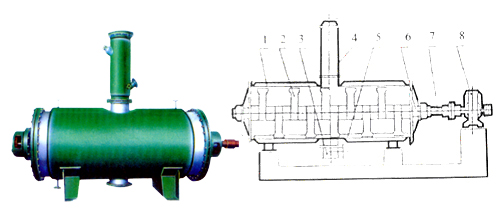 具有結(jié)構(gòu)簡單,操作方便,使用周期長,性能穩(wěn)定可靠,蒸汽耗量小,適用性能強,產(chǎn)品質(zhì)量好,特別適用于不耐高溫、易燃、調(diào)溫下易氧化的膏狀物料的干燥,該機經(jīng)用戶長期使用證明是一良好的干燥設(shè)備。原理:被干燥物料從殼體上方正中間加入,在不斷正反轉(zhuǎn)動的耙齒的攪拌下,物料軸向來回走動,與殼體內(nèi)壁接觸的表面不斷更新,受到蒸汽的間接加熱,耙齒的均勻攪拌,粉碎棒的粉碎,使物料表面水分更有利的排出,氣化的水分經(jīng)干式除塵器、濕式除塵器、冷凝器,從真空泵出口處放空。結(jié)構(gòu):真空耙式干燥機的主要部件